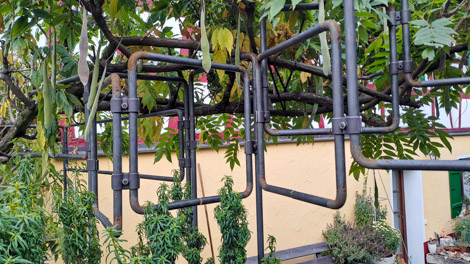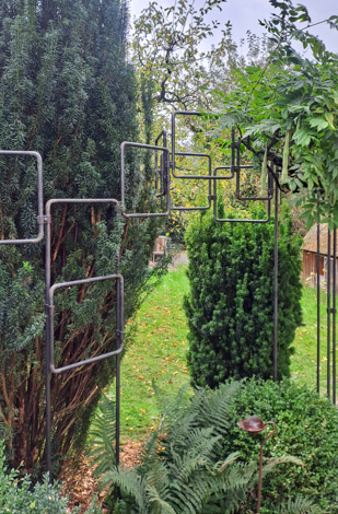 Passend für das Frühjahrserwachen haben wir letztes Jahr das Thema Rankgerüst mal ganz neu gedacht. Rahmen und Streben aus Rundstahl haben wir höhenversetzt verschraubt. Entstanden ist ein kubisch anmutendes Rankgerüst, dass sich dank seiner Offenheit und Leichtigkeit trotz der geometrischen Formen harmonisch in den Garten einfügt und auch schweren Kletterpflanzen wie etwa dem Blauregen im Beispiel stabilen Halt bietet.